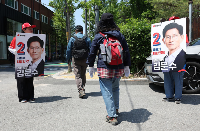 Supporters of People Power Party presidential candidate Kim Moon-soo take part in an election campaign in Seoul on May 18, 2025. (Yonhap)