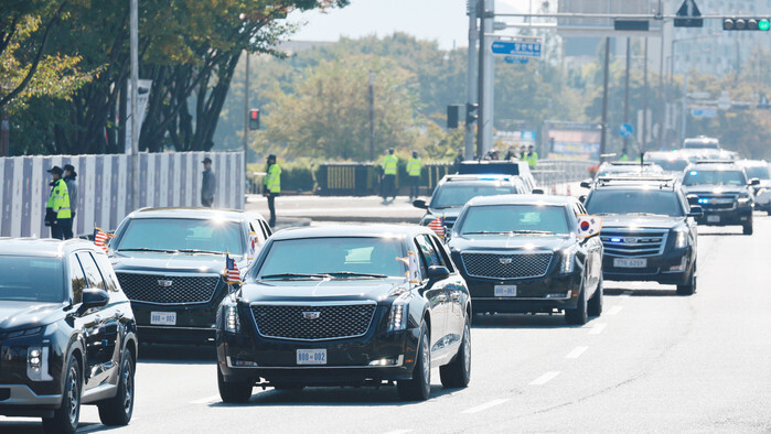 A motorcade carrying U.S. President Donald Trump heads down a road in Gyeongju, North Gyeongsang Province, southeastern South Korea, on Oct. 29, 2025, as he travels to the Gyeongju Arts Center to take part in the CEO Summit of the Asia-Pacific Economic Cooperation forum. (Yonhap)