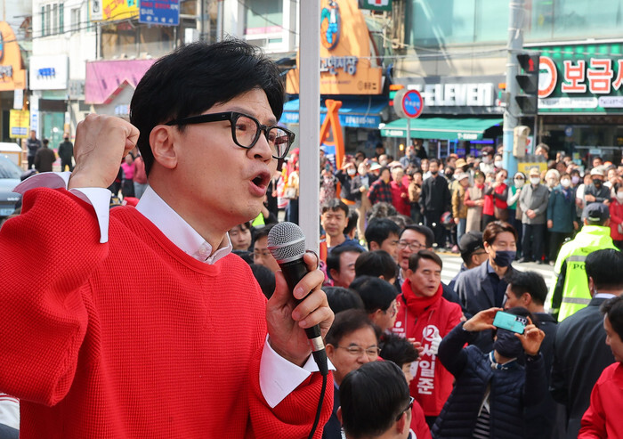 Han Dong-hoon, interim leader of the ruling People Power Party, pleads for voter support on the campaign trail for the party's candidate in Geoje, South Gyeongsang Province, on April 6, 2024, four days ahead of the parliamentary elections. (Yonhap)