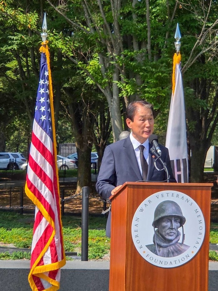 South Korean Veterans Affairs Minister Kwon Oh-eul reads a message on behalf of South Korean President Lee Jae Myung during a ceremony at the Korean War Veterans Memorial in Washington on July 27, 2025, to mark the 72nd anniversary of the signing of the armistice that halted the 1950-53 Korean War, in this photo released by the South Korean ministry. (PHOTO NOT FOR SALE) (Yonhap)
