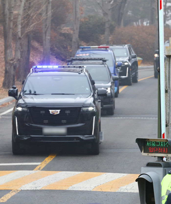 A motorcade carrying arrested President Yoon Suk Yeol leaves the Seoul Detention Center in Uiwang, south of Seoul, on Jan. 21, 2025, en route to the Constitutional Court in the capital, as Yoon will attend the third hearing of his impeachment trial in connection to his short-lived imposition of martial law in December. (Yonhap)