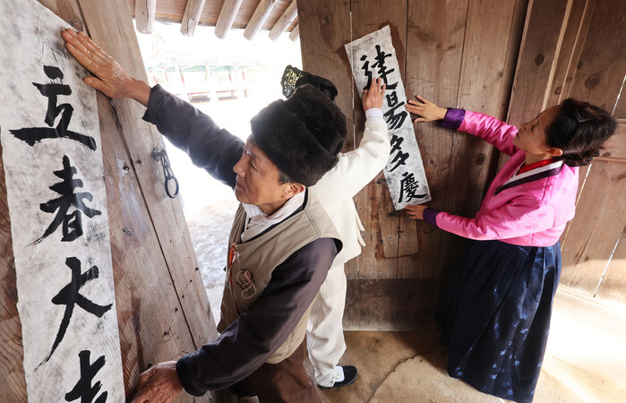 People post paper talismans wishing for good luck ahead of the beginning of spring at the Korean Folk Village in Yongin, about 40 kilometers south of Seoul, on Feb. 2, 2025. (Yonhap)