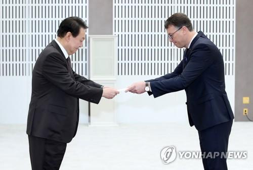 | ▲ President Yoon Suk-yeol (L) receives Lithuanian Ambassador to South Korea Ricardas Slepavicius' credentials at the presidential office in Seoul on Oct. 11, 2022. (Pool photo) (Yonhap) |