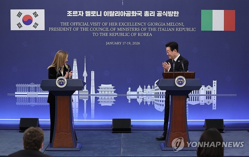 SEOUL, Jan. 19 (Yonhap) -- President Lee Jae Myung and Italian Prime Minister Giorgia Meloni on Monday agreed to strengthen industrial cooperation in the fields of artificial intelligence (AI), aerospace, semiconductors and critical minerals.