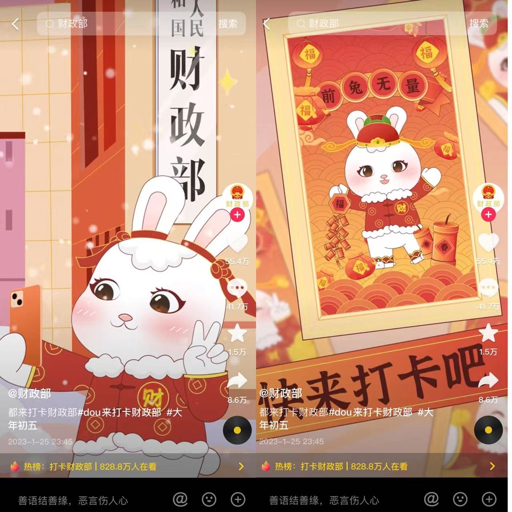 이 동영상에는 토끼 주변에 복과 재물이 쏟아지고, 또 다른 토끼가 재정부 앞에서 인증샷을 찍는 모습이 담겼다.