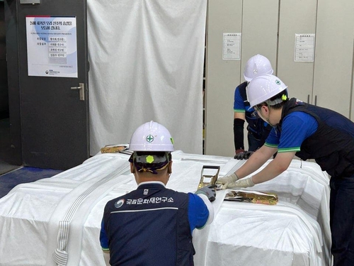 | ▲ '귀향'을 준비하며 (대전=연합뉴스) 김예나 기자 = 지난 27일 대전 국립문화재연구원 관계자들이 약 5년간의 보존 처리 작업을 마치고 문화재보존과학센터 석조복원실에 보관돼 있던 국보 '원주 법천사지 지광국사탑' 부재를 옮기고 있다. 2023.7.31