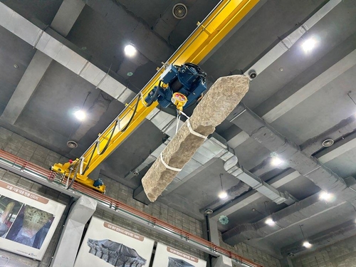 천장에 설치된 호이스트가 움직이자 현장에 있던 10여 명의 관계자들은 눈을 떼지 못했다. 길이가 3m에 이르는 석재를 들어 올려 내리기까지 약 5분, 마침내 '후'하는 소리가 들렸다.