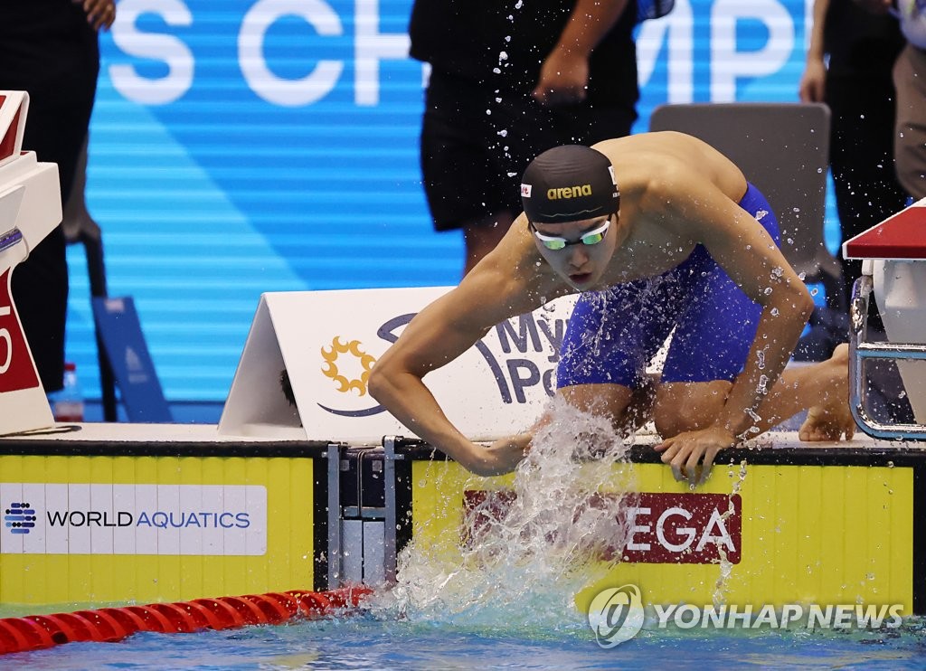 | ▲ Kim Woo-min of South Korea takes a start in the heats for the men's 800-meter freestyle at the World Aquatics Championships at Marine Messe Fukuoka Hall A in Fukuoka, Japan, on July 25, 2023. (Yonhap) |