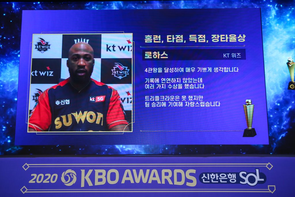 | ▲ 온라인으로 소감 전하는 로하스 (서울=연합뉴스) kt wiz 외야수 멜 로하스 주니어가 30일 서울시 강남구 임피리얼 팰리스 호텔에서 열린 2020 신한은행 쏠(SOL) KBO 시상식에서 정규시즌 MVP를 수상한 뒤 온라인으로 소감을 전하고 있다. 2020.11.30 [KBO 제공. 재판매 및 DB 금지] photo@yna.co.kr |