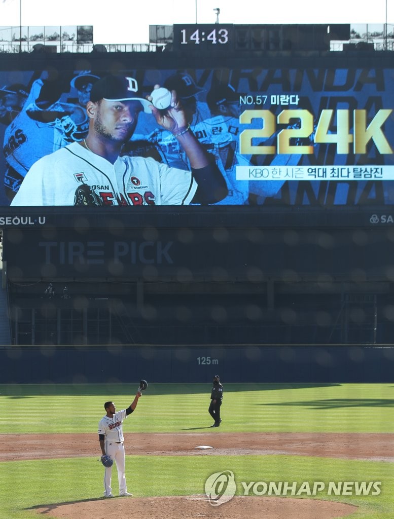 | ▲ In this file photo from Oct. 24, 2021, Ariel Miranda of the Doosan Bears acknowledges the crowd after setting a new single-season strikeout record in the Korea Baseball Organization (KBO) against the LG Twins during the top of the third inning of the clubs' regular season game at Jamsil Baseball Stadium in Seoul. (Yonhap) |