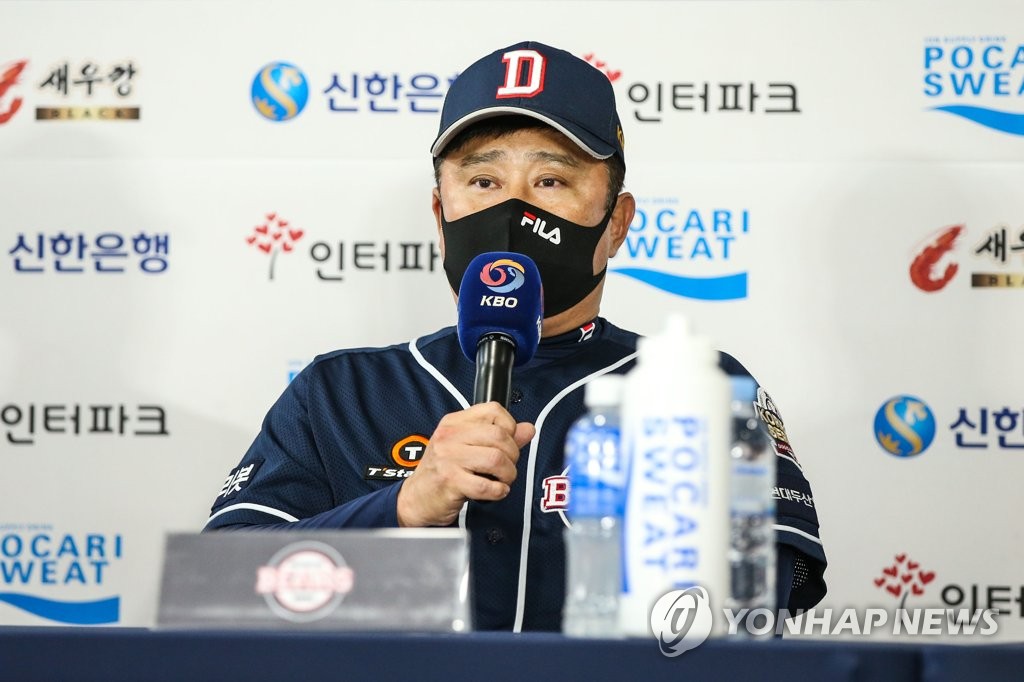| ▲ Doosan Bears manager Kim Tae-hyoung speaks during the Korean Series media day at Gocheok Sky Dome in Seoul on Nov. 13, 2021, in this photo provided by the Korea Baseball Organization. (PHOTO NOT FOR SALE) (Yonhap) |
