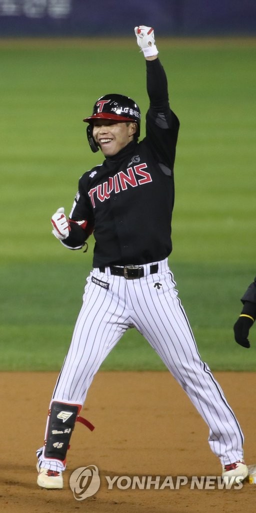 | ▲  Moon Sung-ju of the LG Twins celebrates his two-run double against the Doosan Bears in the top of the seventh inning in Game 2 of the first round in the Korea Baseball Organization postseason at Jamsil Baseball Stadium in Seoul on Nov. 5, 2021. (Yonhap) |