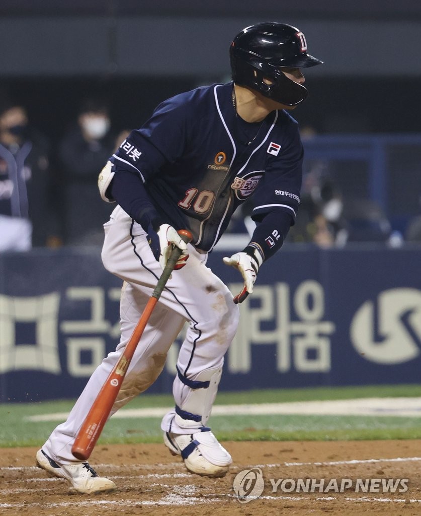 | ▲  Park Sei-hyok of the Doosan Bears hits an RBI single against the LG Twins in the top of the eighth inning in Game 1 of the first round in the Korea Baseball Organization postseason at Jamsil Baseball Stadium in Seoul on Nov. 4, 2021. (Yonhap) |
