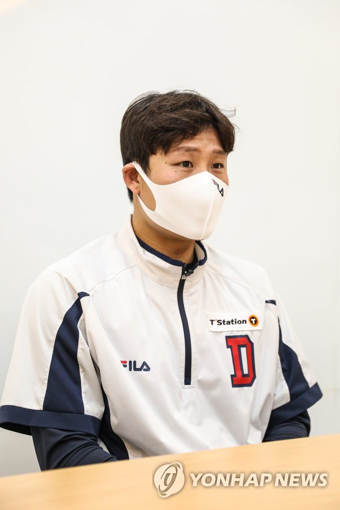 | ▲  Park Sei-hyok of the Doosan Bears speaks to reporters at Jamsil Baseball Stadium in Seoul on Nov. 7, 2021, ahead of Game 3 of the first round in the Korea Baseball Organization postseason. (Yonhap) |