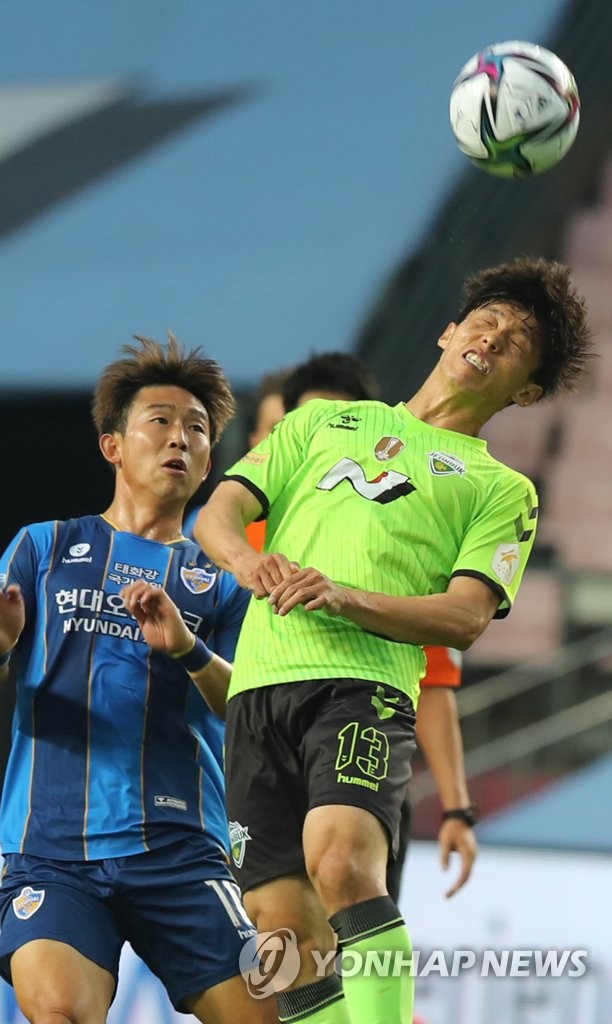 | ▲ Lee Chung-yong of Ulsan Hyundai FC (L) and Mo Barrow of Jeonbuk Hyundai Motors battle for the ball during their clubs' K League 1 match at Jeonju World Cup Stadium in Jeonju, 240 kilometers south of Seoul, on May 19, 2021. (Yonhap) |