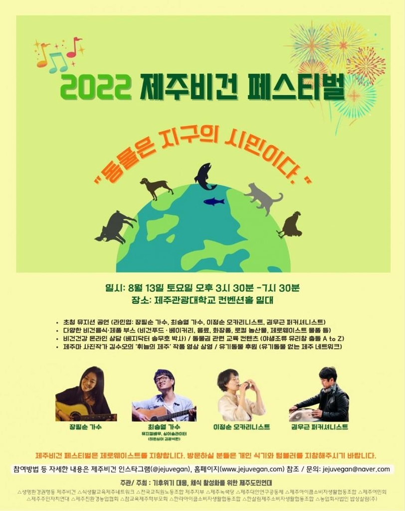 이 축제를 포함해 지난 8일부터 오는 14일까지 '동물은 지구의 시민'을 주제로 한 '비건 위크'가 운영돼 이 기간 곶자왈 걷기, 동물권 전문가 포럼, 청소년 비건 요리 캠프 등 다양한 프로그램이 진행된다.