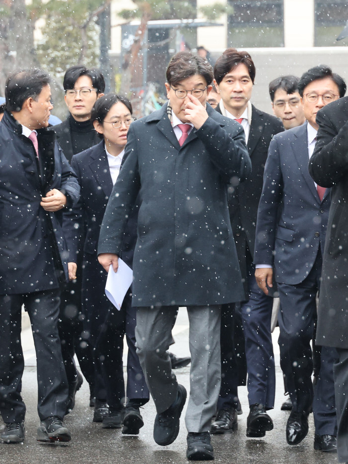 The leadership of the ruling People Power Party, including its floor leader Kweon Seong-dong (C), arrives at the Constitutional Court in Seoul on Feb. 12, 2025, to protest against what the party sees as the lack of measures by the court to guarantee President Yoon Suk Yeol's right to defense during his ongoing impeachment trial over his short-lived imposition of martial law in December. (Yonhap)