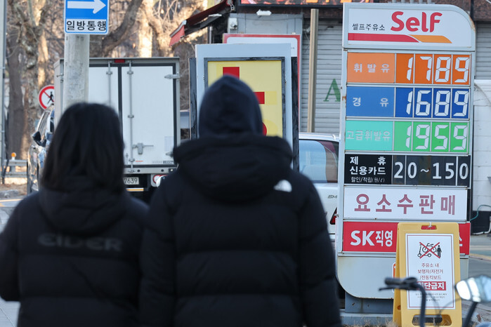 This photo shows a gas station in central Seoul displaying gas prices on Jan. 4, 2026, which have dropped for four consecutive weeks. (Yonhap)