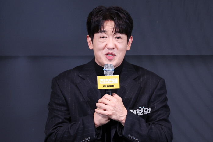South Korean actor Heo Sung-tae, who stars in the new movie "The Informant," responds to reporters' questions during a publicity event in Seoul on Nov. 20, 2025, to promote the movie, set to hit local screens in South Korea on Dec. 3. (Yonhap)