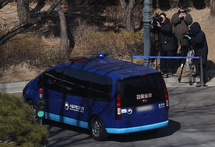 A Ministry of Justice vehicle carrying arrested President Yoon Suk Yeol drives into the Constitutional Court in Seoul on Feb. 18, 2025, as Yoon will attend the ninth hearing of his impeachment trial for his short-lived imposition of martial law in December. (Yonhap)
