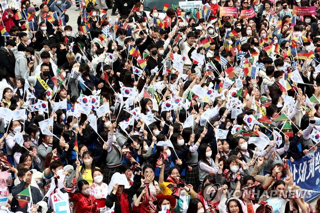 부산역 주변 거리 700m 구간서 실사단 국기 흔들며 환호