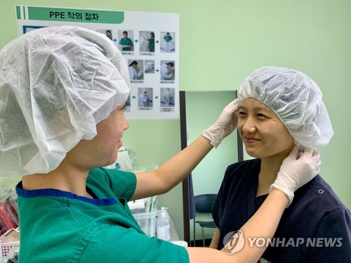 | ▲ '코로나 최전선' 투입된 신임 간호장교 국군대구병원에 투입된 국군간호사관학교 60기 신임 간호장교. 신나은 소위(왼쪽)와 박은지 소위가 마주보고 방호복을 착용을 돕고 있다. 2020.4.10 [국방부 제공. 재판매 및 DB 금지] photo@yna.co.kr |