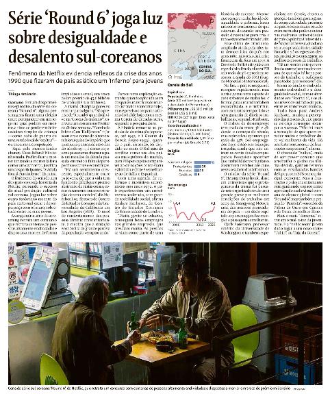 대부분 브라질 매체를 통해 '오징어 게임'이 소개되고 있는 가운데 유력 일간지 폴랴 지 상파울루는 11일(현지시간) 이례적으로 국제면 기사를 통해 '오징어 게임'의 열풍을 전하면서 한국 사회를 조명했다.