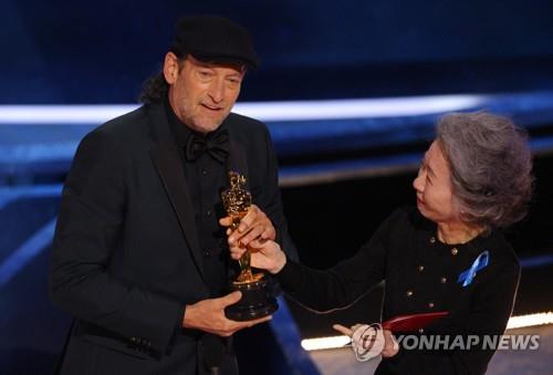 지난해 '미나리'로 오스카 여우조연상을 받은 윤여정은 시상자로 무대에 올라 코처에게 트로피를 전달했다.