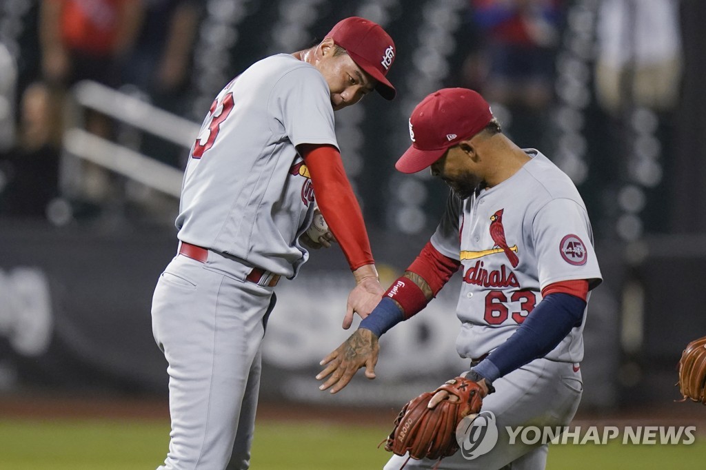 ▲ In this Associated Press photo, Kim Kwang-hyun of the St. Louis Cardinals (L) celebrates with teammate Edmundo Sosa after defeating the New York Mets 7-6 in a Major League Baseball regular season game at Citi Field in New York on Sept. 14, 2021. (Yonhap)