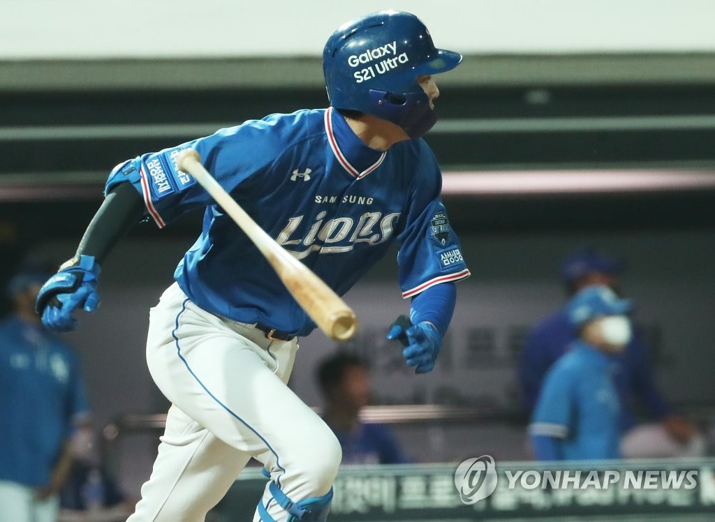▲ Koo Ja-wook of the Samusng Lions runs to first base after hitting a sacrifice fly against the KT Wiz in the top of the fifth inning of a Korea Baseball Organization regular season game at KT Wiz Park in Suwon, 45 kilometers south of Seoul, on May 13, 2021. (Yonhap)