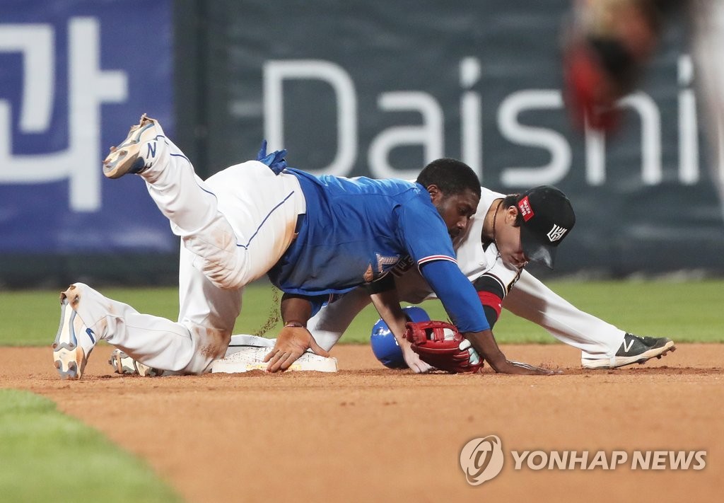 ▲ Jose Pirela of the Samsung Lions (L) steals second base against the KT Wiz in the top of the eighth inning of a Korea Baseball Organization regular season game at KT Wiz Park in Suwon, 45 kilometers south of Seoul, on May 13, 2021. (Yonhap)