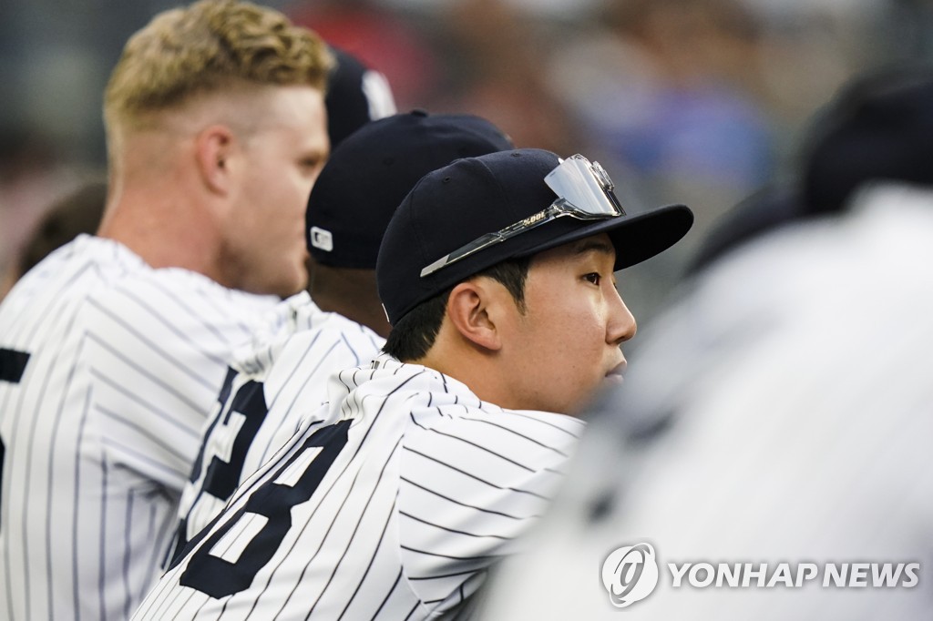 | ▲ In this Associated Press photo, Park Hoy-jun of the New York Yankees (C) watches his team in action against the Boston Red Sox in a Major League Baseball regular season game at Yankee Stadium in New York on July 16, 2021. (Yonhap) |