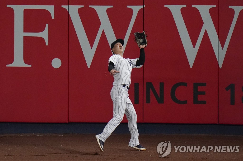 | ▲ In this Associated Press photo, Park Hoy-jun of the New York Yankees catches a fly ball hit by Rafael Devers of the Boston Red Sox in the top of the ninth inning of a Major League Baseball regular season game at Yankee Stadium in New York on July 16, 2021. (Yonhap) |