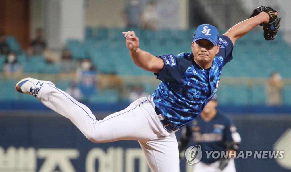 | ▲ In this file photo from June 13, 2021, Oh Seung-hwan of the Samsung Lions pitches against the NC Dinos in the top of the ninth inning of a Korea Baseball Organization regular season game at Daegu Samsung Lions Park in Daegu, 300 kilometers southeast of Seoul. (Yonhap) |