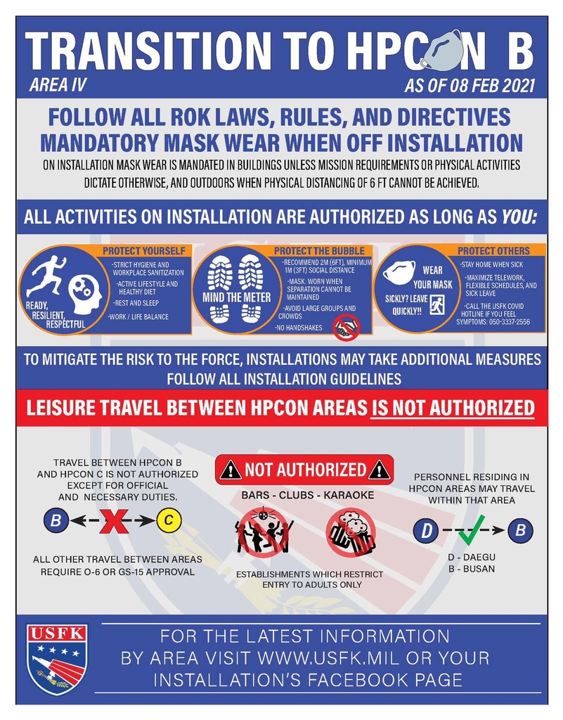 The Health Protection Condition (HPCON) level will be adjusted by one notch to the second-lowest level of "Bravo" from "Charlie" for USFK areas I and III and the Seongnam district, effective Monday at 7 a.m., according to the U.S. military.