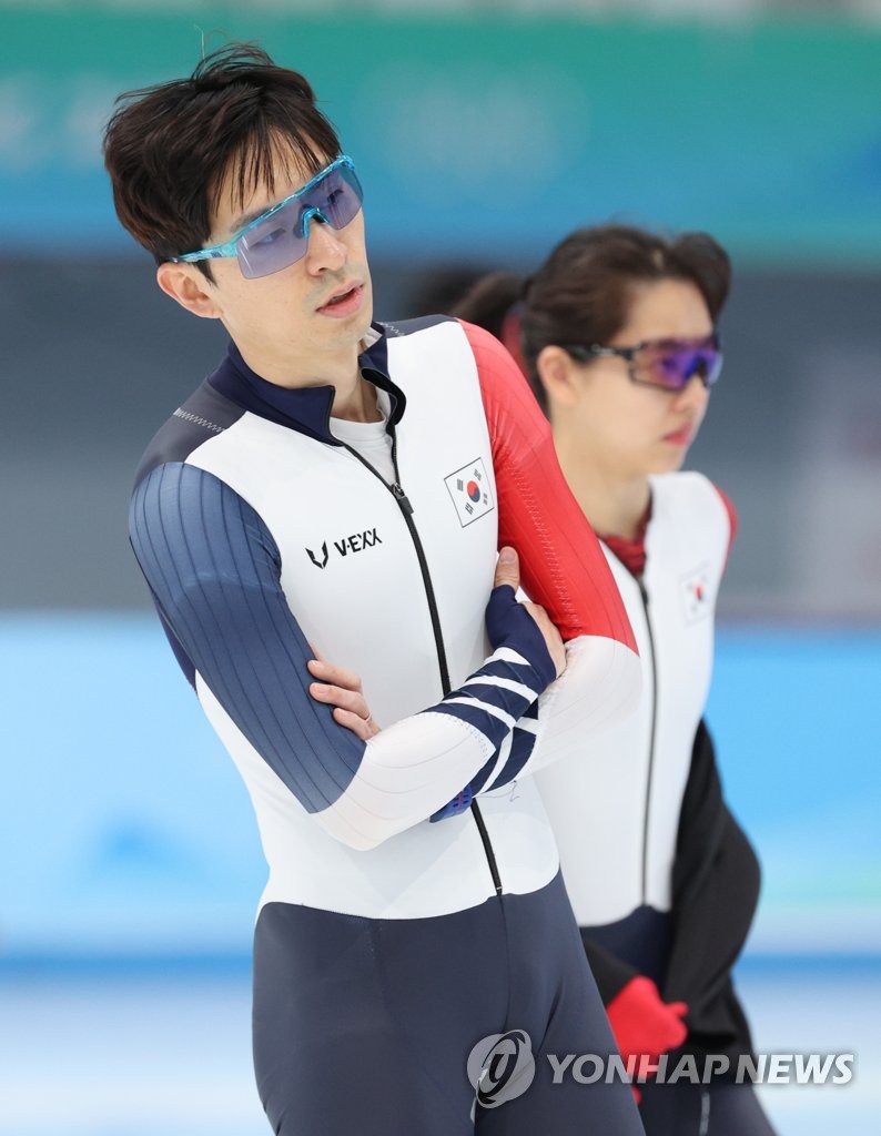 | ▲ South Korean speed skater Lee Seung-hoon (L) takes a moment during a training session at the National Speed Skating Oval in Beijing on Feb. 4, 2022, in preparation for the Beijing Winter Olympics. (Yonhap) |