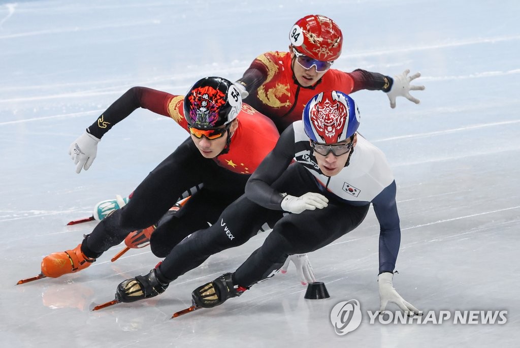 | ▲  Hwang Dae-heon of South Korea (R) competes in the semifinals of the men's 1,000m short track speed skating race at the Beijing Winter Olympics at Capital Indoor Stadium in Beijing on Feb. 7, 2022. (Yonhap) |