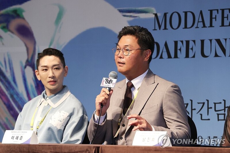 | ▲ 국제현대무용제 질의응답 (서울=연합뉴스) 강민지 기자 = 15일 서울 중구 더플라자호텔에서 열린 제42회 국제현대무용제(MODAFE 2023) 기자간담회에서 이해준 조직위원장이 취재진의 질문에 답하고 있다.왼쪽은 홍보대사로 위촉된 배우 김호영. 2023.9.15 mjkang@yna.co.kr |