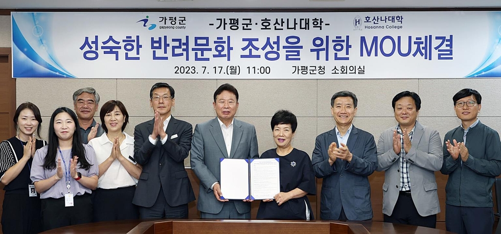 (가평=연합뉴스) 김도윤 기자 = 경기 가평군은 17일 한국기독교문화진흥원 호산나대학과 성숙한 반려 문화를 조성하는 내용의 업무 협약을 체결했다.