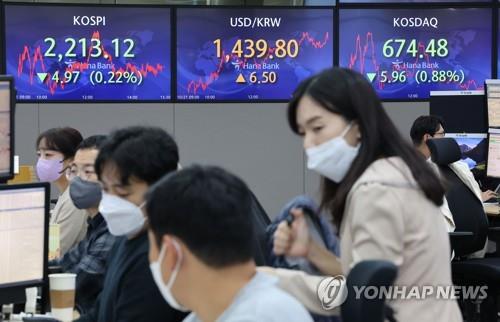 | ▲ Electronic signboards at a Hana Bank dealing room in Seoul show the benchmark Korea Composite Stock Price Index (KOSPI) closed at 2,213.12 points on Oct. 21, 2022, down 0.22 percent from the previous session's close. (Yonhap) |