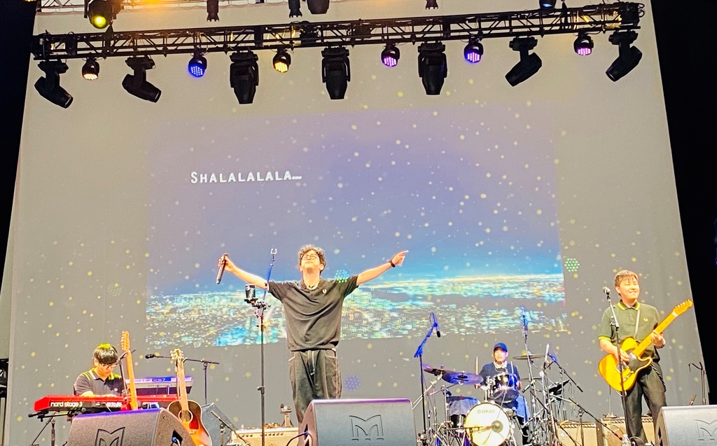 | ▲ 뉴욕서 '별빛이 내린다' 열창하는 안녕바다 (뉴욕=연합뉴스) 강건택 특파원 = 27일(현지시간) 밤 미국 뉴욕시 링컨센터에서 열린 'K-인디 뮤직 나이트' 무대에 오른 '안녕바다'가 히트곡 '별빛이 내린다'를 부르고 있다. 2022.7.27. firstcircle@yna.co.kr. |
