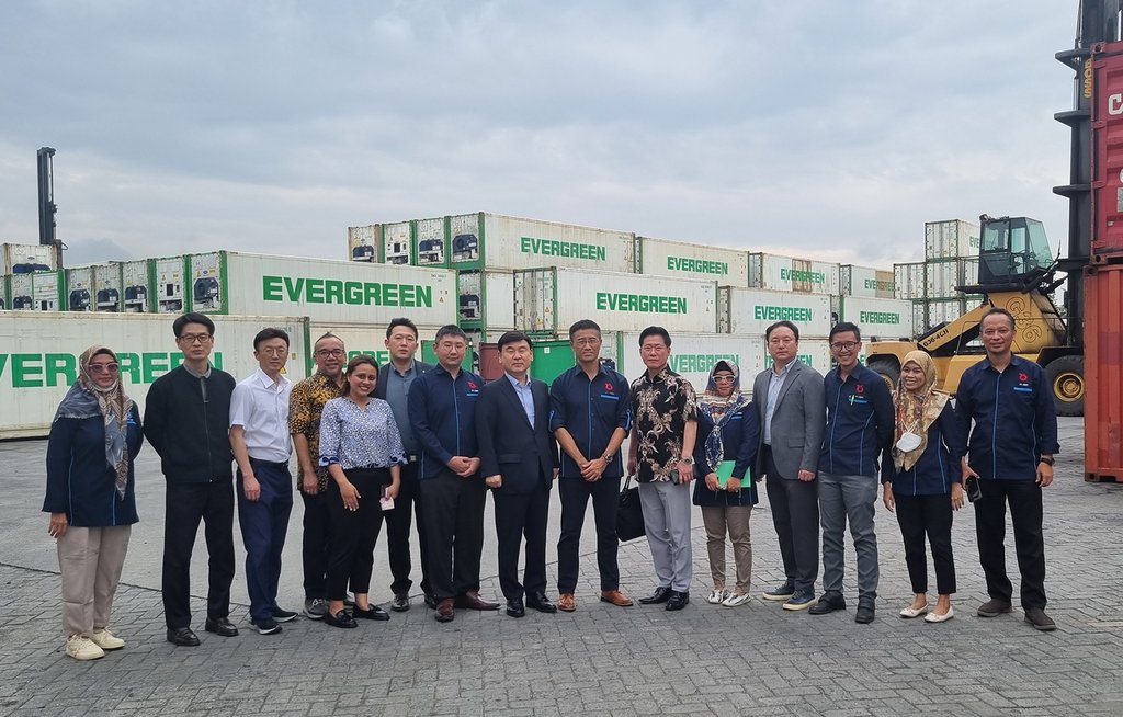 | ▲ Officials from Hanjin Transportation Co. and PT Multi Bina Pura International, an Indonesian logistics company, pose for a photo in front of the container yard of the Indonesian company on Feb. 14, 2023. (PHOTO NOT FOR SALE) (Yonhap) |