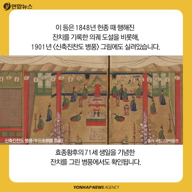 이 등은 1848년 헌종 때 행해진 잔치를 기록한 의궤 기록을 비롯해 1901년 '신축진찬도 병풍' 그림에도 실려있습니다.