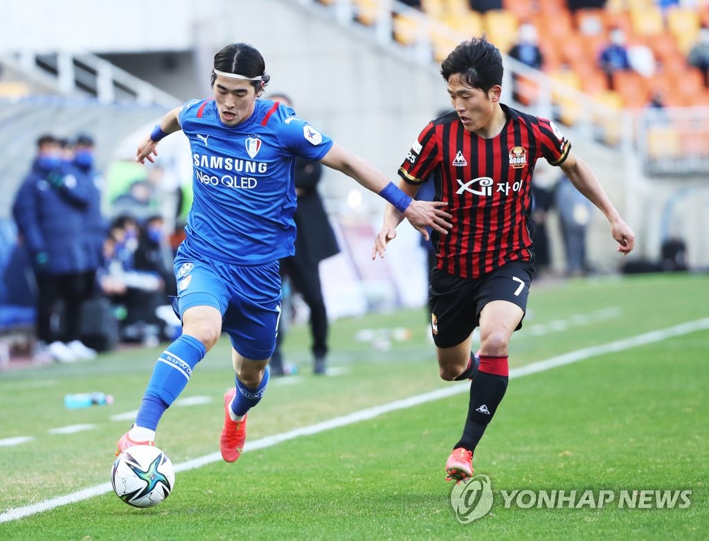 | ▲ In this file photo from March 21, 2021, Kim Tae-hwan of Suwon Samsung Bluewings (L) tries to dribble past Na Sang-ho of FC Seoul during a K League 1 match at Suwon World Cup Stadium in Suwon, 45 kilometers south of Seoul. (Yonhap) |