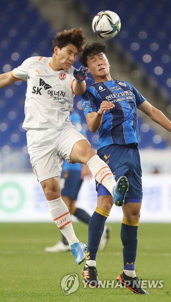| ▲ In this file photo from March 16, 2021, Joo Min-kyu of Jeju United (L) and Won Du-jae of Ulsan Hyundai FC vie for the ball during their clubs' K League 1 match at Ulsan Munsu Football Stadium in Ulsan, 415 kilometers southeast of Seoul. (Yonhap) |