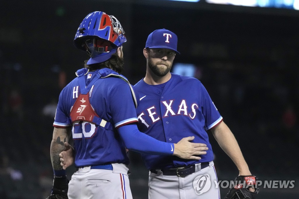 | ▲ 3회에 등판해 9회까지 던진 조던 라일스 (피닉스 USA투데이스포츠/로이터=연합뉴스) 텍사스 레인저스 우완 조던 라일스(오른쪽)가 8일(한국시간) 미국 애리조나주 피닉스의 체이스필드에서 벌어진 2021 미국프로야구 메이저리그 애리조나 다이아몬드백스와의 방문 경기에 3회 구원 등판해 9회까지 던진 뒤 포수 요나 하임과 포옹하고 있다. |