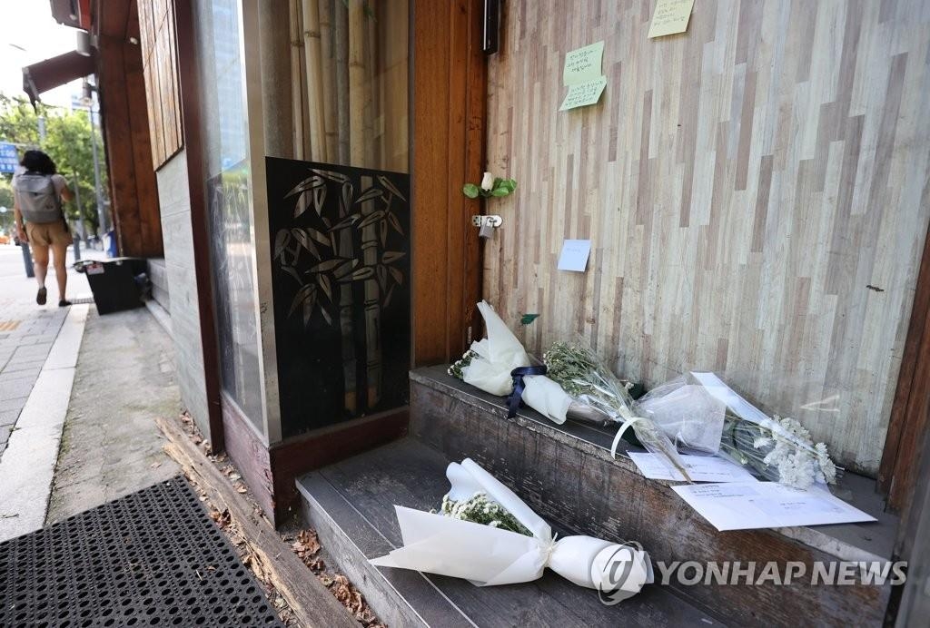 | ▲ Bouquets of flowers are laid in front of a bar whose owner committed suicide after suffering economic difficulties due to pandemic-related business restrictions in Seoul on Sept. 14, 2021. (Yonhap) |