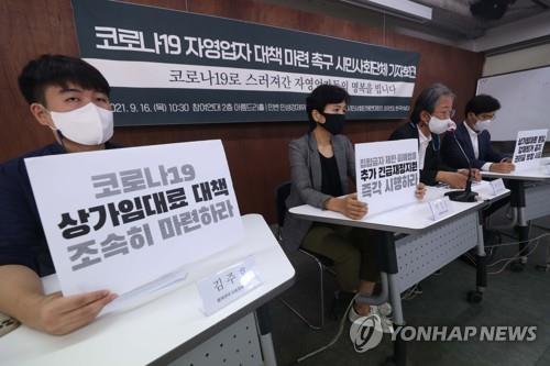 SEOUL, Sept. 16 (Yonhap) -- South Korean civic groups called on the government Thursday to come up with "drastic" measures to help lessen the hardship of self-employed workers and small business owners, many of them in deep financial trouble caused by the protracted coronavirus pandemic.