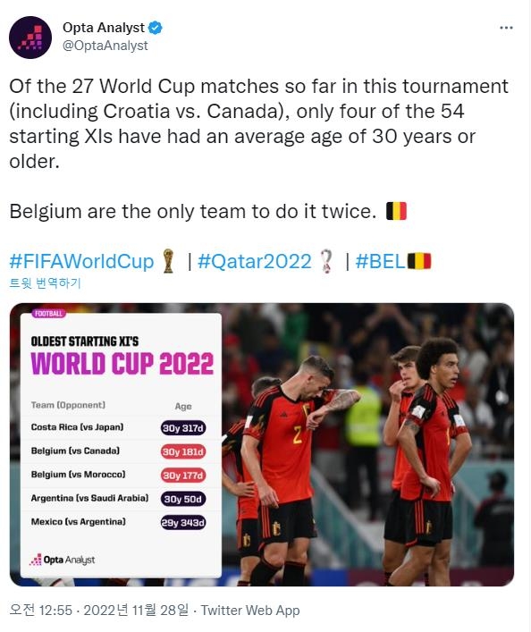 기록업체 옵타에 따르면, 벨기에는 이번 대회 캐나다와 모로코전에 평균 연령 각각 30세 181일, 30세 177일의 선수들을 선발로 내보냈다.