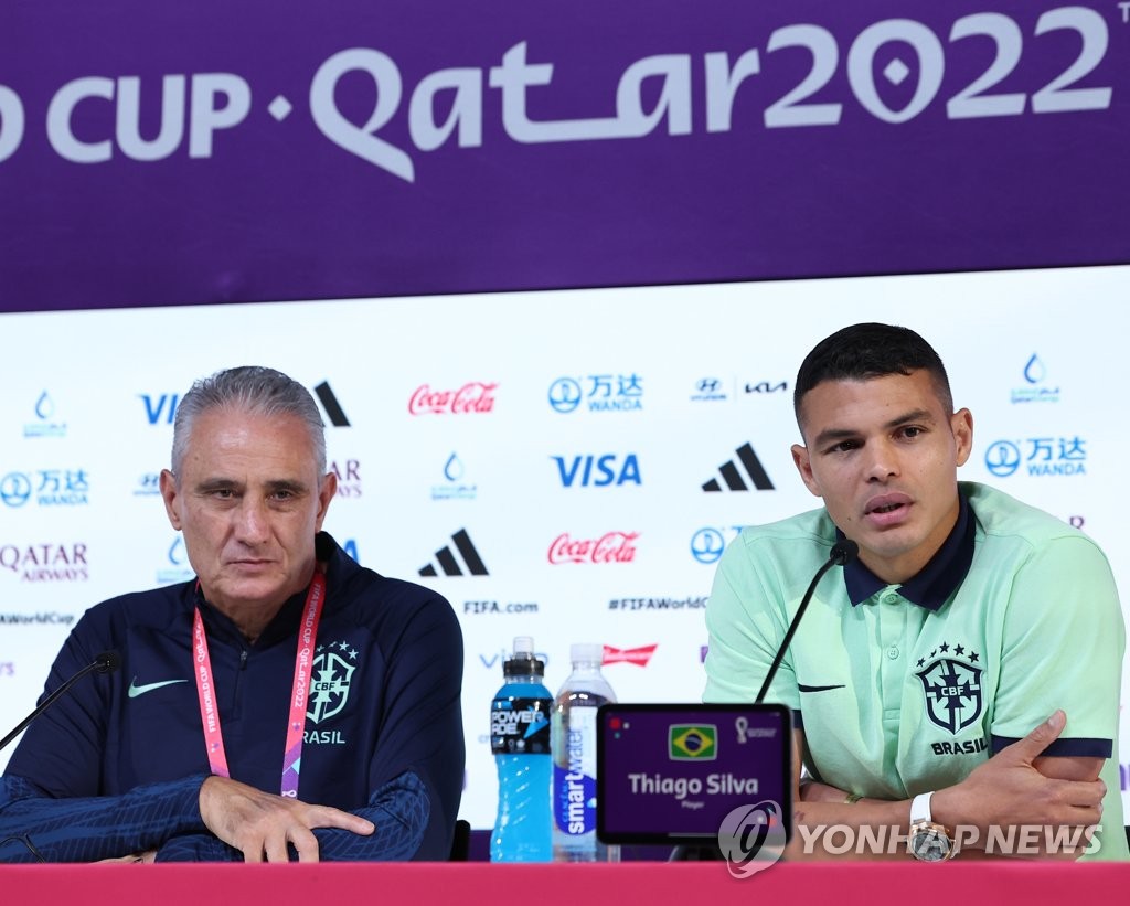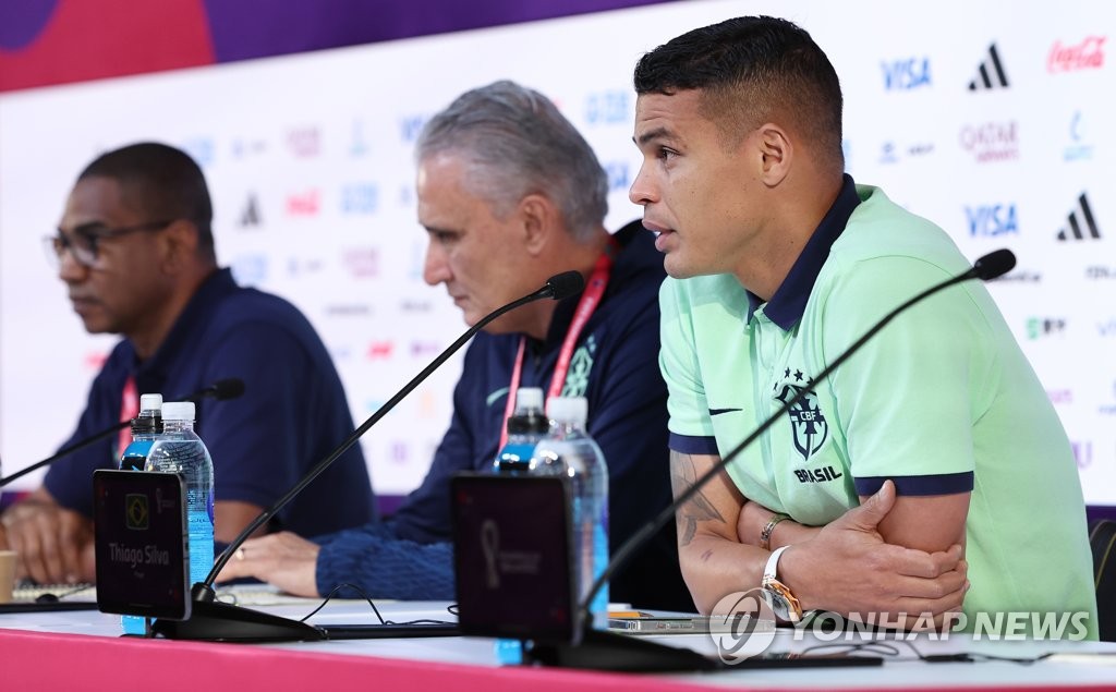 | ▲ 공식 인터뷰하는 치아구 시우바 (알라이얀=연합뉴스) 임헌정 기자 = 2022 카타르 월드컵 16강전 한국과 브라질의 경기를 하루 앞둔 4일(현지시간) 카타르 알라이얀의 카타르 국립 컨벤션센터(QNCC)에 마련된 미디어센터(MMC)에서 브라질 치아구 시우바가 공식 인터뷰를 하고 있다. 왼쪽은 치치 감독. 2022.12.4 kane@yna.co.kr |